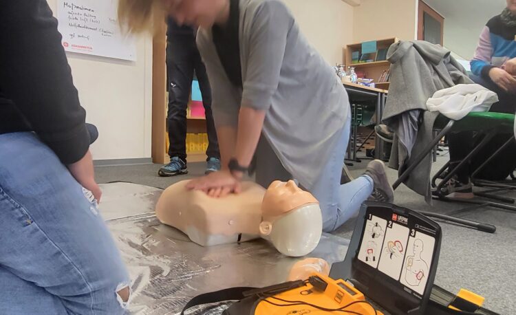 Ende Januar bildeten sich 13 Lehrkräfte in Erster Hilfe fort. Hierzu waren die Johanniter bei uns zu Gast und zeigten uns u. a. den „hautnahen“ Umgang mit dem Defibrillator. Aber auch das Absetzen des Notrufs, die Behandlung von Bienenstichen und Hitzeschlägen waren, neben vielen weiteren Aspekten, Teil der Fortbildung.